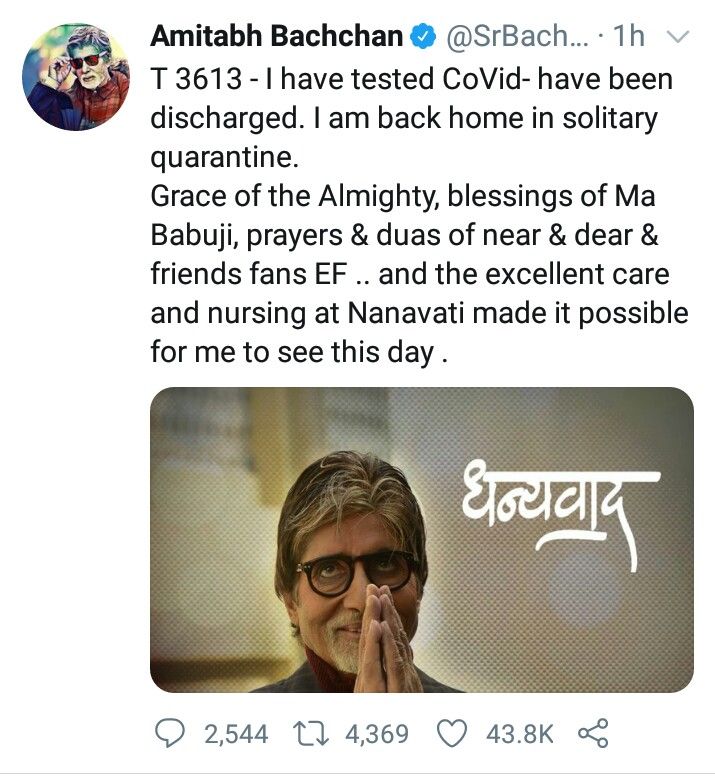 અમિતાભ બચ્ચને પોતાની ટ્વિટમાં લખ્યું છે કે 'કોરોના નેગેટિવ આવ્યા પછી મને હોસ્પિટલમાંથી રજા આપવામાં આવી છે. હું ઘરે કોરેન્ટાઇન થઈશ. માતા,અને બાબુજી ના આશીર્વાદ, શુભેચ્છકો અને મિત્રોના આશીર્વાદ, નાણાવટી હોસ્પિટલમાં ઉત્તમ સારવાર ને કારણે મને આ દિવસ જોવાનું શક્ય બન્યું. '