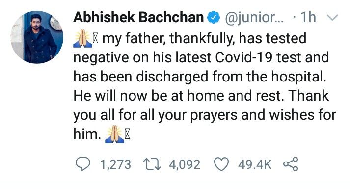 આ સાથે જ અભિષેક બચ્ચને પોતાની ટ્વિટમાં લખ્યું છે કે 'હું આભારી છું કે મારા પિતાનો કોવિડ 19 ટેસ્ટ નકારાત્મક આવ્યો છે અને તેમને હોસ્પિટલમાંથી રજા આપવામાં આવી છે. હવે તેઓ ઘરે રોકાશે અને આરામ કરશે.
