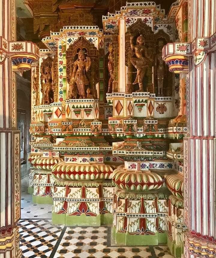 આ મંદિર લાલ રંગના રેતીનો પત્થરનો ઉપયોગ કરીને સુંદર ચિત્રો અને પીળા-પથ્થરની કોતરણીથી દિવાલો, અભયારણ્યના સ્તંભો અને મંડપ પર બનાવવામાં આવ્યો છે.