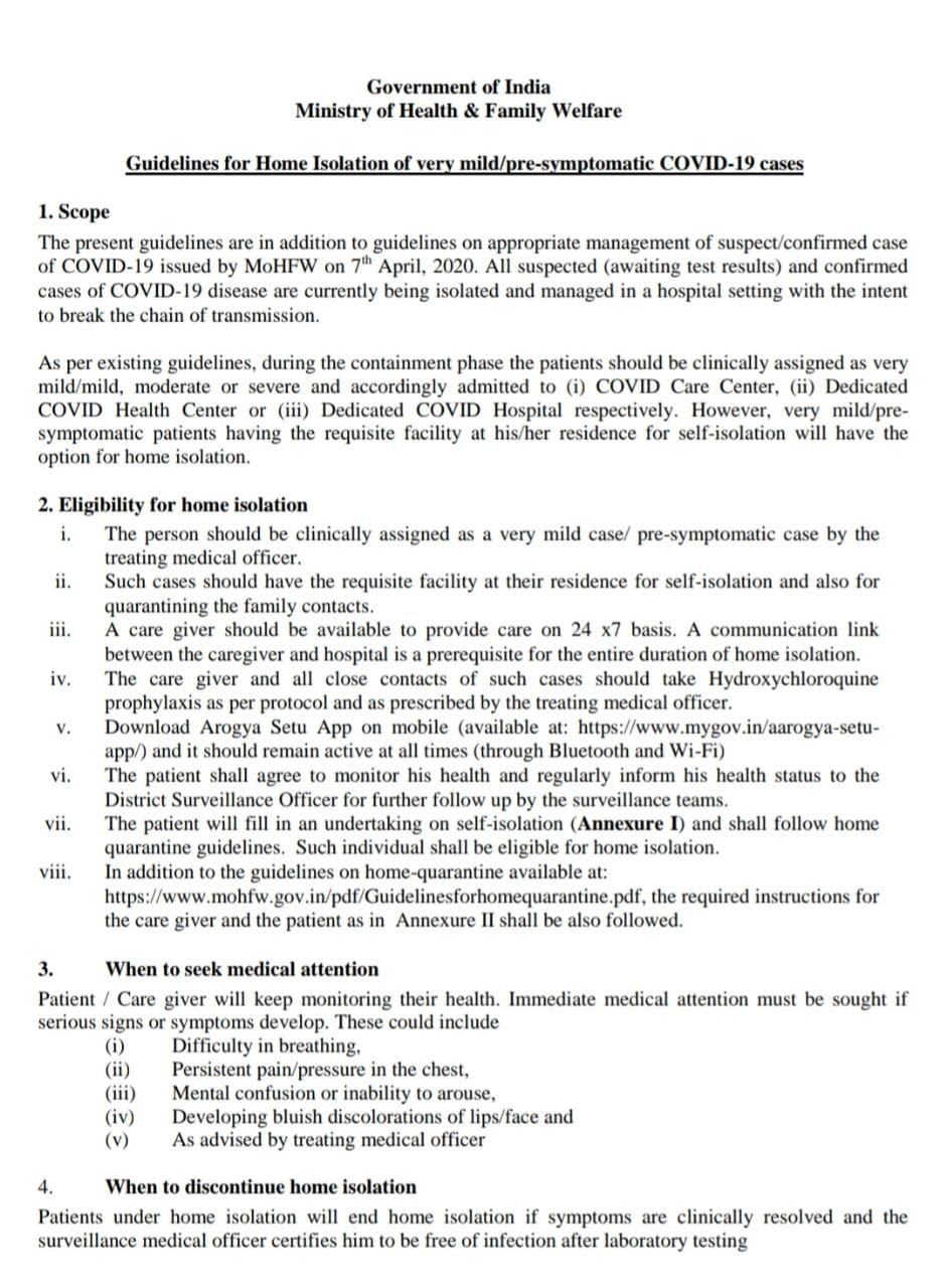 જેમાં જણાવ્યા અનુસાર, જેને કોરોના વાયરસના વધારે લક્ષણો ના હોય તેવા દર્દીઓ અથવા તો સારી રોગપ્રતિકારક શક્તિ ધરાવતા હોય અથવા તો હાલત કફોડી ના હોય તેવા દર્દીઓ ઘરમાં રહી પોતાની સારવાર લઈ શકશે આ પ્રકારનું જાહેરનામું કેન્દ્ર સરકારના આરોગ્ય વિભાગ દ્વારા બહાર પાડવામાં આવ્યું છે,