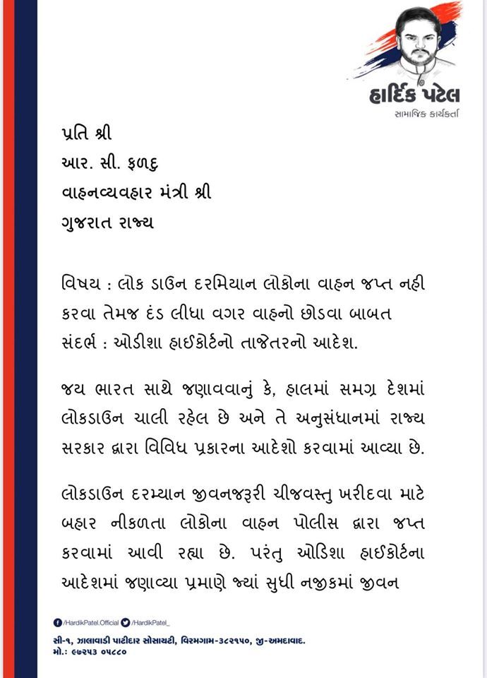 હાર્દિકે પોતાના પત્રમાં જણાવ્યું છે કે, જય ભારત સાથે જણાવવાનું કે હાલમાં સમગ્ર દેશમાં લોકડાઉન ચાલી રહેલ છે. તે અનુસંધાનમાં રાજ્ય સરકાર દ્વારા વિવિધ પ્રકારના આદેશો કરવામાં આવ્યા છે. લોકડાઉન દરમ્યાન જીવન જરૂરી ચીજ વસ્તુ ખરીદવા માટે બહાર નીકળતા લોકોના વાહન પોલીસ દ્વારા જપ્ત કરવામાં આવી રહ્યા છે. પરંતુ ઓડીશા હાઇકોર્ટમાં જણાવ્યા પ્રમાણે જ્યાં સુધી નજીકમાં જીવન જરૂરી ચીજ વસ્તુ ઉપલબ્ધ કરાવવામાં ન આવે ત્યાં સુધી આવી રીતે વાહનો જપ્ત કરવા તે અયોગ્ય છે.