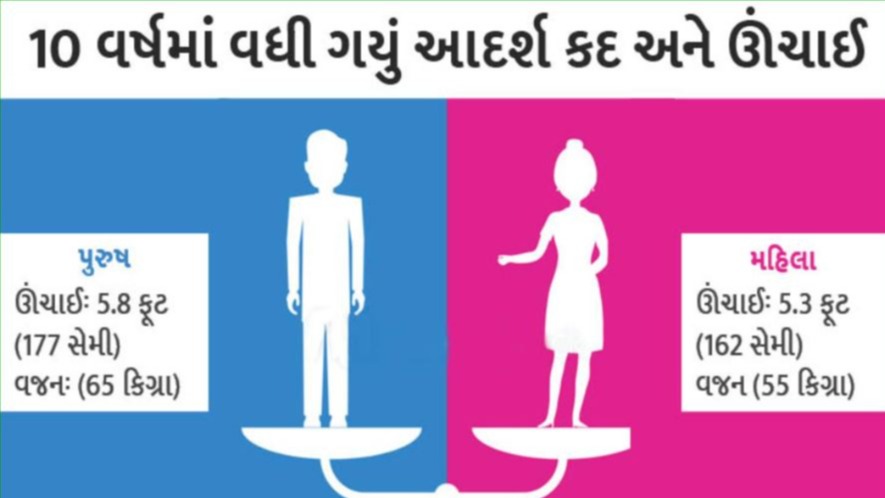 ➡️ ભારતીય પુરુષોની આદર્શ ઊંચાઈ 5.6 ફૂટ (171 સેમી)થી વધીને 5.8 ફૂટ (177 સે.મી.) થઈ ગઈ છે. મહિલાઓની આદર્શ ઊંચાઈ 5 ફૂટ (152 સેમી)થી વધારીને 5.3 ફૂટ (162 સેમી) કરવામાં આવી છે. એનાથી બોડી માસ ઈન્ડેક્સ (BMI) કાઢવાની ફોર્મ્યુલા પણ બદલી શકાય છે.