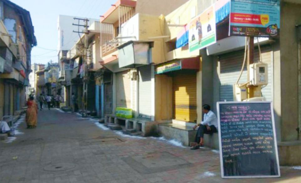 વેપારીઓ દૂકાનો બંધ રાખે તેવી અપીલ કરતું બોર્ડ માર્ગો પર મૂકાયું