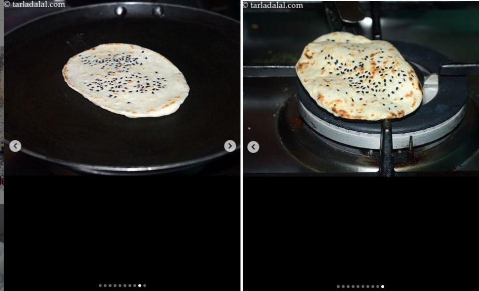 લુવાનાં એક ભાગને દબાવીને તેને વણો તેની ઉપર અડધી ચમચી કાળા તલ ભભરાવો. હવે મેદાનું અટામણ લઇને તેને લાંબી લાંબી ઇંડાનાં આકારની વળો. હવે એક નોન સ્ટિક તવાને ગરમ કરો. અને તલ વાળો ભાગ નીચે રહે તે રીતે તેની ઉપર નાન રાખો