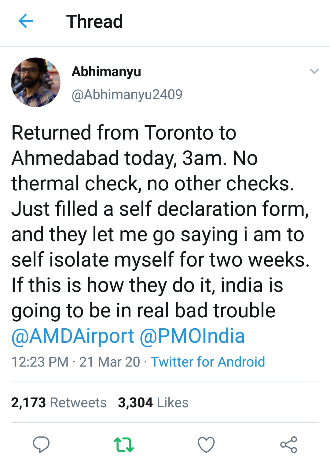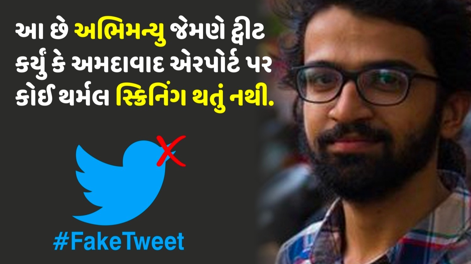 આ છે @અભિમન્યુ જેમણે ટ્વીટ કર્યું છે કે અમદાવાદ એરપોર્ટ પર કોઈ થર્મલ સ્ક્રિનિંગ નથી થતું. તેણે એરપોર્ટ અધિકારીઓ  સાથે પુછપરસ કરવાની કાળજી લીધી નહીં પણ ટ્વીટ્ કરી અફવા અને ગભરાટ ફેલાવ્યો..