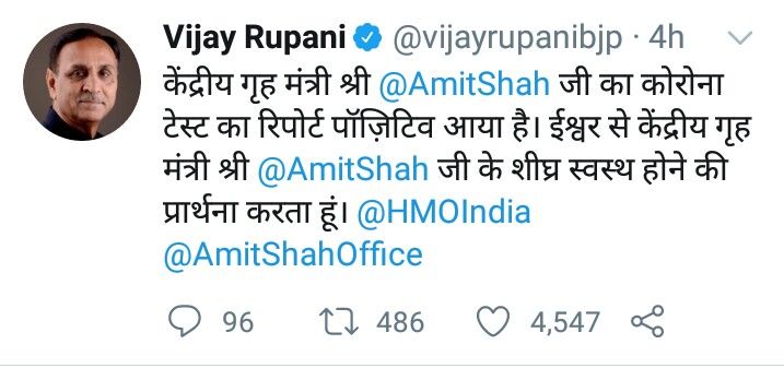 કેન્દ્રીય ગૃહમંત્રી અમિત શાહનો કોરોના રિપોર્ટ પોઝિટિવ આવતા ગુજરાતના મુખ્યમંત્રી વિજય રૂપાણીએ ટ્વિટ કરી જણાવ્યુ કે અમિત શાહનો કોરોના રિપોર્ટ પોઝિટિવ આવ્યો છે.તેઓ જલ્દી થી સાજા થાય એવી ભગવાન ને પ્રાર્થના