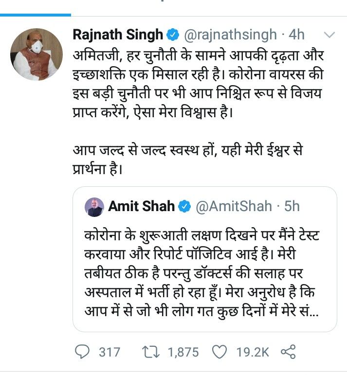 અમિત શાહે તેઓ કોરોના પોઝિટિવ આવ્યા છે તેવી ટ્વિટ કરી જેને લઈને સંરક્ષણ પ્રધાન રાજનાથસિંહે ટ્વિટ કરી પ્રતિક્રિયા આપી કે અમિતજી દરેક ચુનોતી માટે એક ઉદાહરણ છે.તેઓ કોરોના વાયરસના આ એક મોટા પડકાર સામે ચોક્કસપણે જીત મેળવશે અને હું માનું છું. આપ જલ્દીથી સ્વસ્થ્ય થાવ એ જ મારી ઈશ્વરથી પ્રાથના છે.